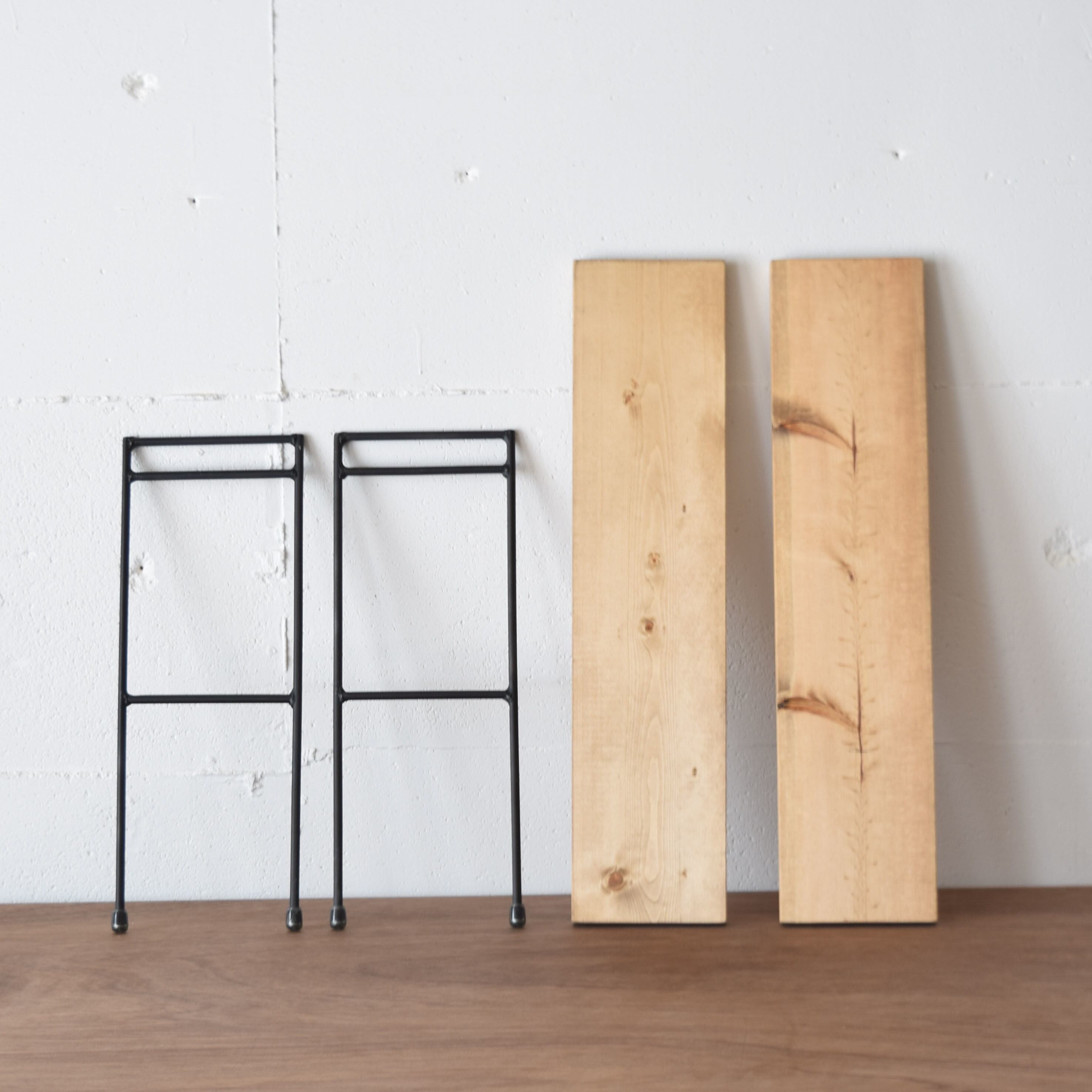 アイアン脚に木の板を挟み込むだけの簡単組み立て。